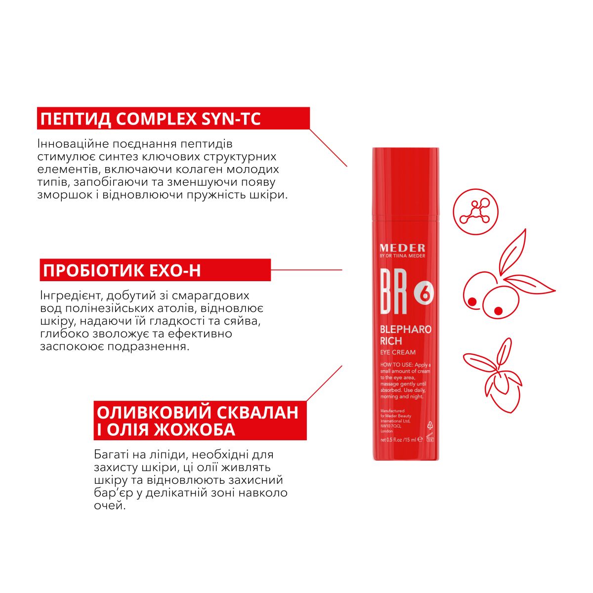 Легка емульсія живить і глибоко зволожує ніжну шкіру навколо очей, повертаючи їй природний комфорт і гладкість. Завдяки формулі, дружній до мікробіому, Blepharo-Rich підтримує загальне здоров’я шкіри, зберігаючи баланс мікрофлори.