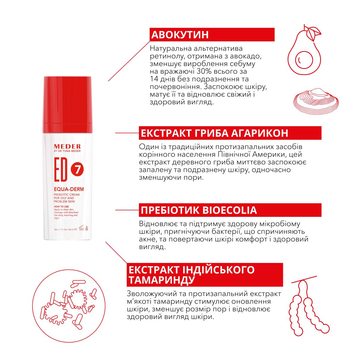 Багаторазово відзначений нагородами зволожувальний крем Equa-Derm спеціально створений для жирної шкіри. Його інноваційна формула вже з першого дня зменшує надлишкове виділення шкірного сала. Крем бореться із запаленнями та акне, не викликаючи подразнення чи підвищеної чутливості.