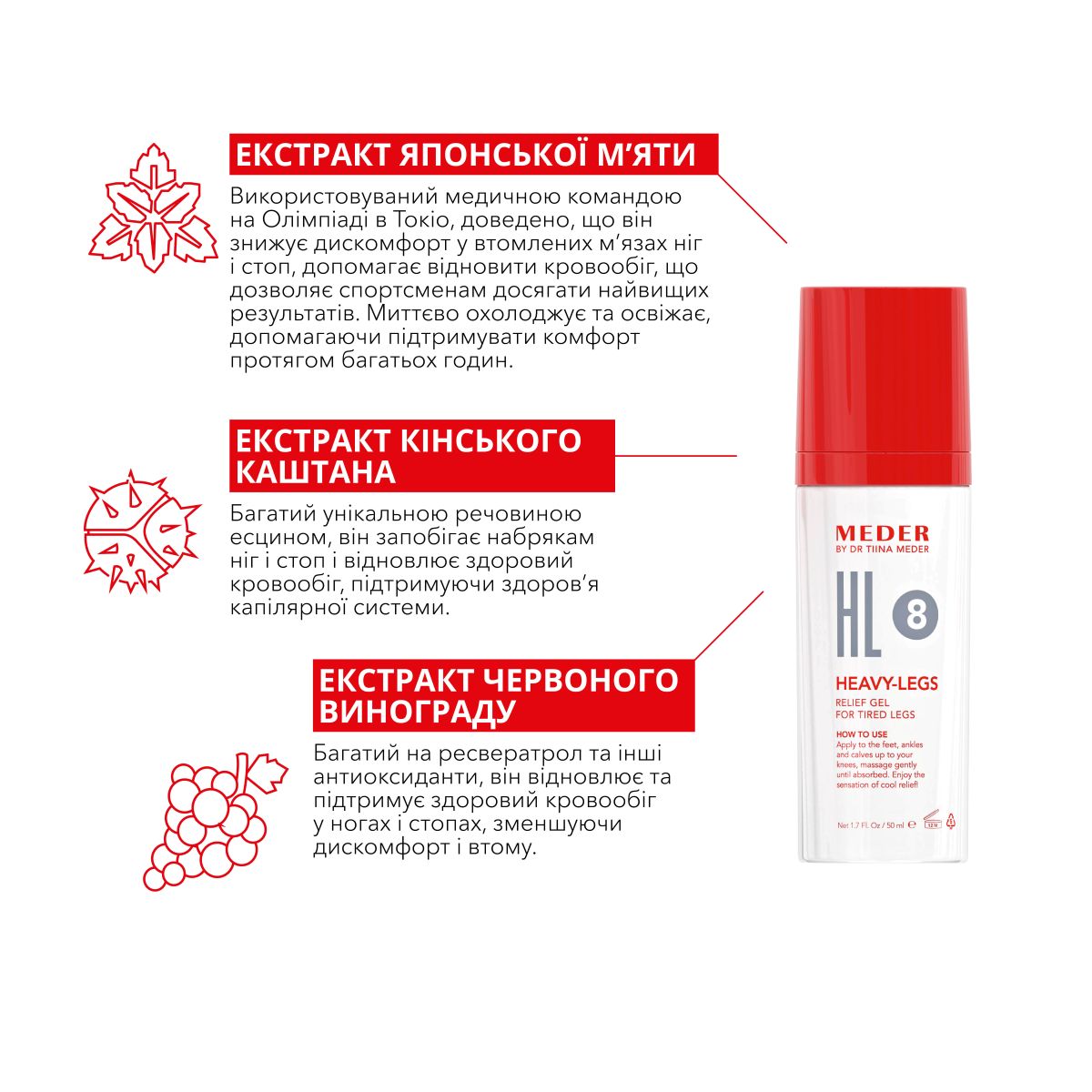Відзначений нагородами гель Heavy-Legs від відчуття важкості в ногах забезпечує миттєве відчуття прохолоди, полегшення та комфорту для ніг і ступнів. Якщо ви хочете зберегти легкість і комфорт після виснажливого дня або довгого перельоту, цей гель стане вашим ідеальним рішенням.