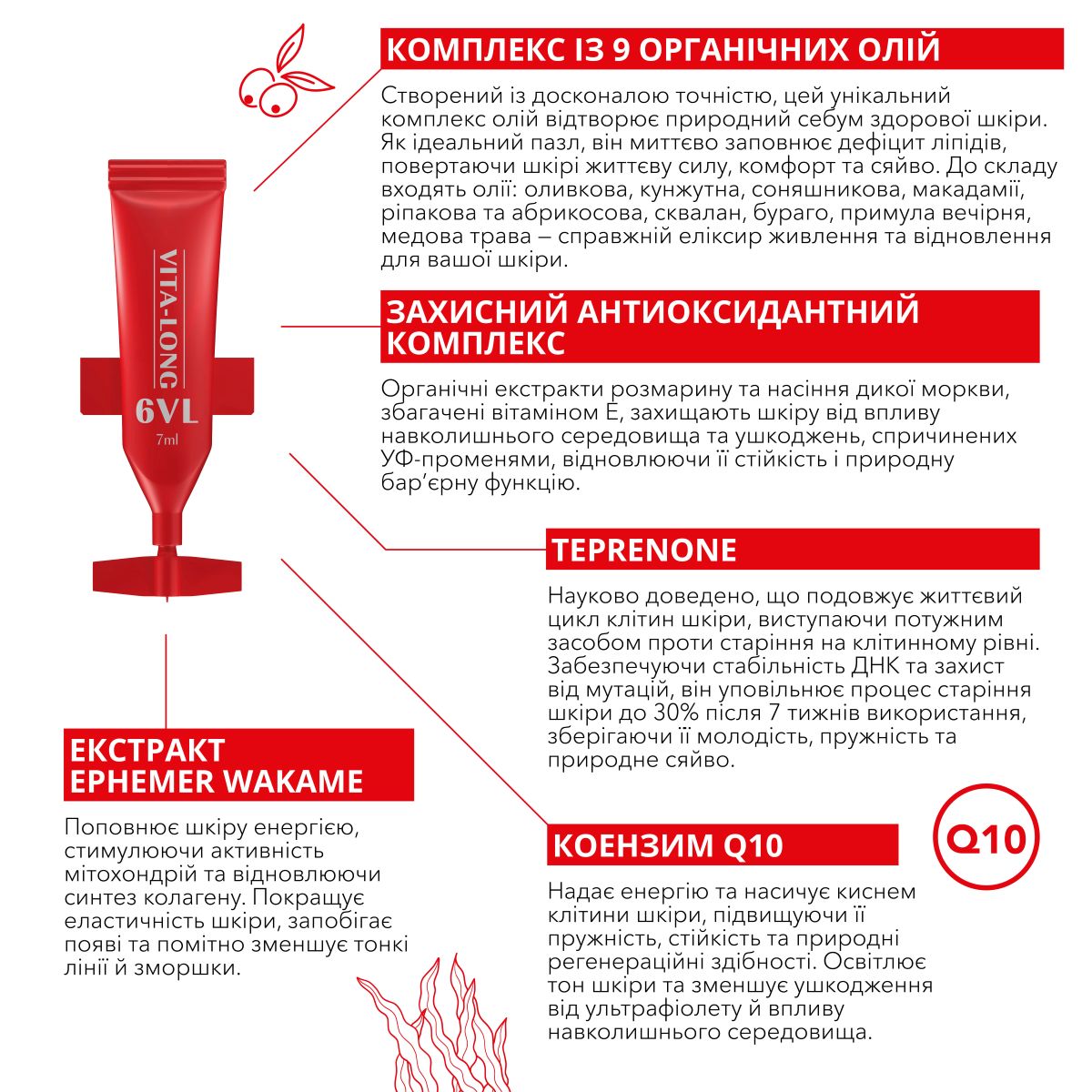 Vita-Long не лише зменшує шкоду від ультрафіолету, але й покращує щільність шкіри, запобігає сухості та утворенню зморшок.